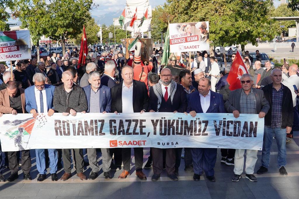 Saadet Partisi Bursa İl Başkanlığı 5 Ekim Pazar günü Gazze’de yaşanan soykırım ve Ablukayı kırmak için yola çıkan Sumud Filosuna yapılan baskını telin etmek amacıyla Bursa
